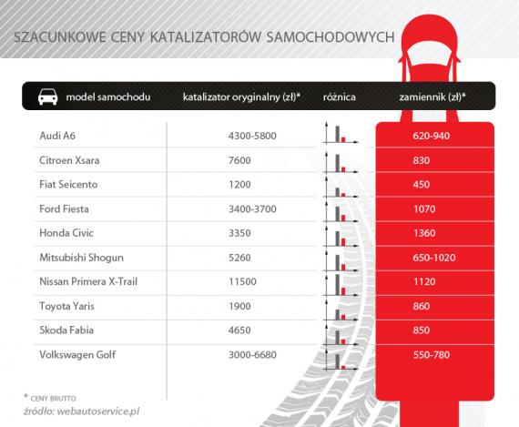 Koszty ponoszone przez ofiary kradzieży to w sumie minimum kilkaset złotych. Przykładowo, za nowy katalizator do Volkswagena Passata B5 zapłacić trzeba ok. 500 zł. Tymczasem w przypadku oryginalnej części dedykowanej Audi RS4 cena oscyluje w granicach 5000 zł. Poza kupnem katalizatora, konieczne jest ponadto opłacenie montażu, co – jak wskazuje ekspert webautoservice.pl – oznacza dodatkowy koszt rzędu nie mniej niż 100 zł. Całkowity rachunek strat może być więc bardzo dotkliwy.