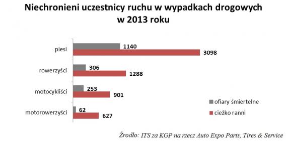 Od wielu lat najpoważniejszym problemem na polskich drogach jest bardzo duże zagrożenie niechronionych uczestników ruchu, do których zalicza się pieszych, rowerzystów, motocyklistów i motorowerzystów. Te cztery grupy uczestników ruchu w 2013 roku stanowiły 53% ofiar śmiertelnych w wyniku wypadków drogowych, a także 51% ciężko rannych. Szczególnie niepokojący był wzrost zabitych (o 2%) i ciężko rannych (o 7%) rowerzystów, tym bardziej, że liczba ofiar w tej grupie rośnie od 2011 roku. W samochodach osobowych zginęło natomiast 43% wszystkich zabitych w wypadkach drogowych, w autach ciężarowych - 3%, a niecały 1% w autobusach, które tym samym są jednym z bezpieczniejszych środków transportu drogowego.