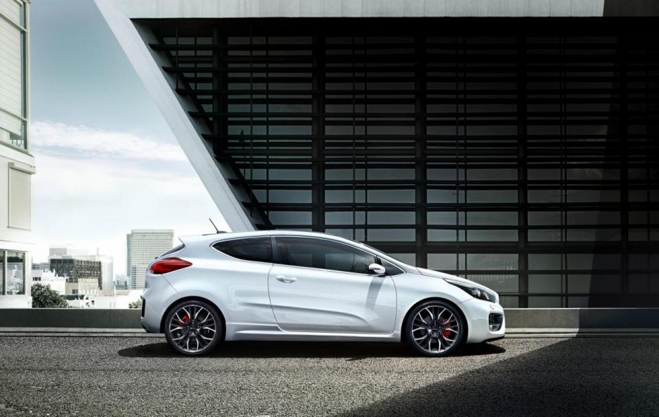 Ostro zarysowane linie nadwozia sprawiają, że obok nowego cee'd nikt nie przejdzie obojętnie. Wzrok przykuwa grill w stylu "Tiger nose" oraz światła wykonane w technologii LED. Z profilu, świetnie wyglądają 18-calowe felgi ze stopów lekkich oraz wkomponowane w nie czerwone zaciski hamulców. Tył to klasyczna, poszerzająca się ku dołowi sylwetka ze sportowym, podwójnym układem wydechowym. Technicznie GT ma obniżone i usztywnione zawieszenie oraz większe tarcze hamulców. Wewnątrz zamontowano kubełkowe fotele Racaro i aluminiowe pedały.