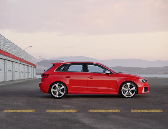 Patrząc na nowe Audi RS 3 Sportback z boku, uwagę przykuwają poszerzone przednie błotniki, kanciaste progi, obudowy lusterek bocznych w kolorze matowego aluminium oraz duży spojler na brzegu dachu. Wyrazisty zderzak, lśniący połyskiem czarny dyfuzor z kratownicą o strukturze plastra miodu z wzmacniającym użebrowaniem oraz dwie duże, owalne końcówki rur wydechowych, nadają charakteru tyłowi pojazdu. Osłonę chłodnicy Singleframe i pokrywę bagażnika zdobią emblematy RS 3.