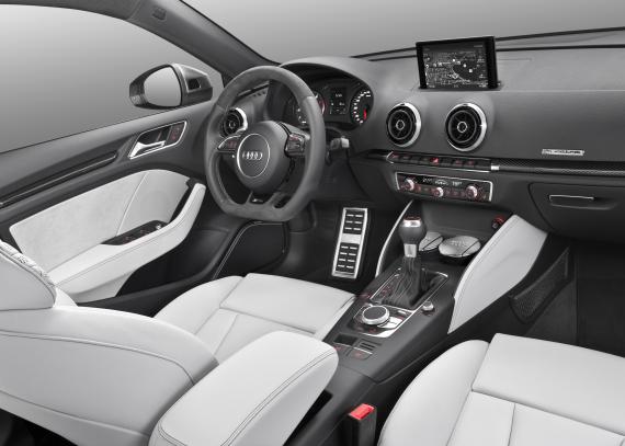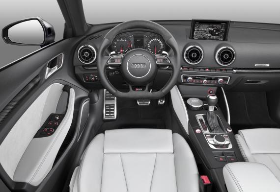 Standardowe wyposażenie nowego Audi RS 3 Sportback obejmuje asystenta parkowania plus i radio MMI. Audi oferuje również opcjonalnie sportowe fotele S z obszyciem w kształcie rombów, tłoczonymi emblematami i opcjonalnymi jasnymi obiciami, a także – po raz pierwszy w segmencie kompaktowym – nowo zaprojektowane fotele kubełkowe RS ze zintegrowanymi bocznymi poduszkami i konstrukcją z karbonu. Są one o siedem kilogramów lżejsze niż standardowe siedzenia sportowe. Kolejną atrakcyjną opcją jest pakiet stylistyczny RS 3. We wnętrzu wyposażonego w niego pojazdu boki tunelu środkowego, nawiewy, dywaniki oraz pasy bezpieczeństwa mają czerwone akcenty, a czerwień przebija także przez perforację sportowych foteli S.